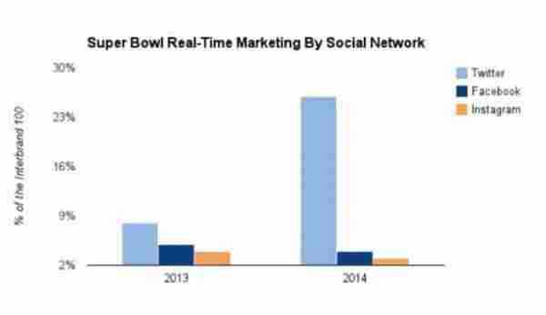 分析发现,全球100大品牌中去年有8家在超级碗期间通过Twitter发布赛事相关内容进行实时营销,而今年这个数字猛增到了29家;在去年的8家品牌商中,有6家今年继续在Twitter进行实时营销推广,留守率高达75%。而市场营销专家关于超级碗的社交媒体报告基本都是以Twitter为主要平台。