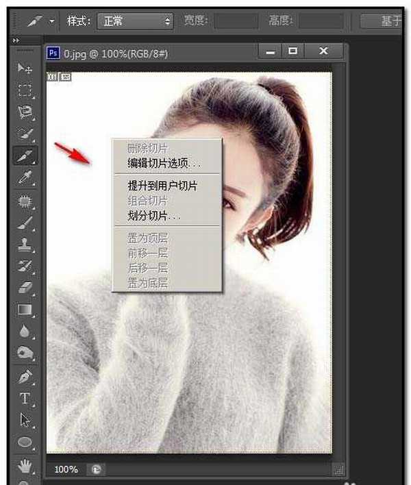 4、点“切片工具”后,鼠标变成一把小刀的样子。鼠标在图片上,右击,弹出的对话框。