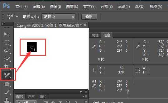 6、将阈值滑块拉向右边,找到最亮点,用颜色取样器标注