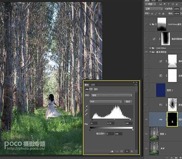图片中,环境细节太多,层次不明显,人物不够突出。这时候首先用色阶配合蒙版提升人物的对比度,提高主体存在感。(图中用黄色的方框表示文中提到的内容)。