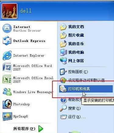 如果在开始菜单中没有找到 打印机和传真 入口,可以进入 开始--设置---控制面板 中找到.