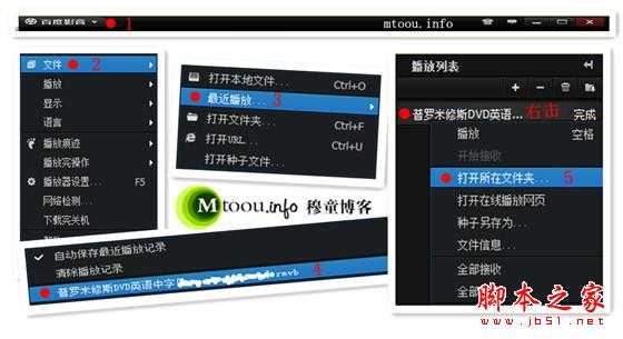 这样一个步骤找到播放的影片,然后我们就可以在右边的播放列表中点击鼠标右键,在弹出的“打开所在文件夹”即可发现影片缓存所保存的具体文件夹目录了哦。结合上面穆童制作的图片,按照其步骤来你会发现这是一件很简单的事情。好啦,说到这里我想你已经知道该怎么做了。