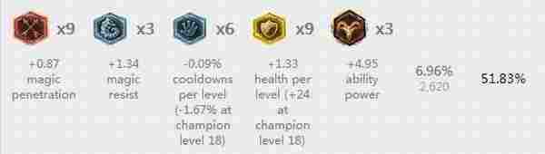 符文红色选择9个法穿,蓝色3个固定魔抗和6个成长减CD,黄色9个成长生命值,精华3个法强。