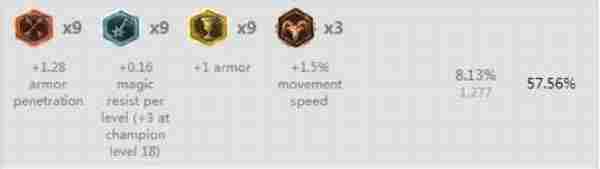 红色:9*护穿,黄色:9*固定护甲,蓝色:9*成长魔抗,大精华:3*移速。护穿对于刷野的效率是不啻于攻击力的,而且前期护穿对于线上英雄的伤害会相当卓越。