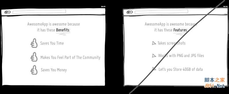 以目标为导向,人们更关注产品能给他们带来怎样的好处,而不是产品具有哪些功能。“好处”可以更加清晰的定义产品的价值。Chris Guillebeau在"The $100 Startup”当中写道,人们非常关注于拥有更多的爱、金钱、认同、能自由分配的时间;同时希望有更少的压力、矛盾、麻烦与不确定性。当你向用户介绍产品时,我相信总会有一定的空间来向他们展示产品所带来的好处,能帮他们解决的问题,等等。