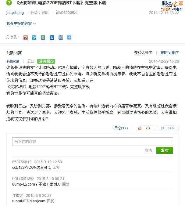 第三个是百度知道,又是一个引流神器,在这里特别是用在电影资源的下载上面。点击这个知道进去一看,浏览量超过60000次,不过看内容就知道是纯通过SEO手法做的营销贴,内容八杆子打不到,只不过其中加入了关键词。这种手法可能很多人不知道目的何在,不过只要你点击评论就知道了,它的推广信息藏在评论里面了。