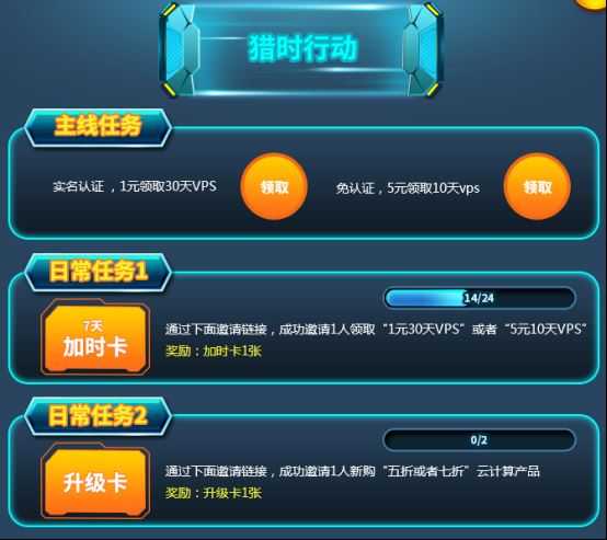 日常任务1:通过邀请链接,成功邀请1个人领取“1元30天vps”或者“5元10天vps”奖励7天加时卡1张,可以为您的vps服务器延长7天业务时间。