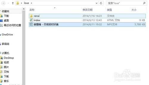 7、修改背景音乐,找到renxi.mp3,删除,挑一首你喜欢的MP3,再重命名为renxi即可。例如,我把谢霆锋—你微笑时好美当作背景音乐。小编提醒:文件不要太大,加载起来很久。