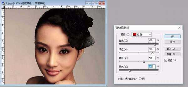 4、可选颜色。我们接着调整一下照片中的红色,从而让照片中的人像脸色更加的健康与红润。