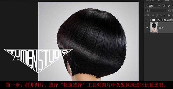 1、打开图片,选择“快速选择”工具对图片中头发区域进行快速选取。