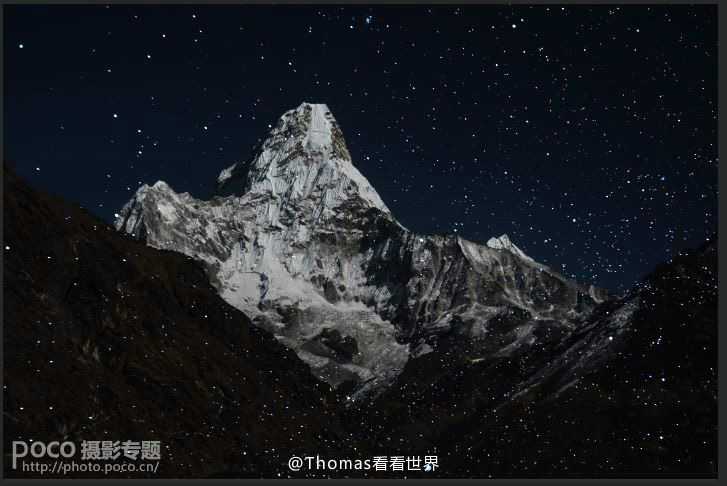 比如下面这张,托马斯经过Ama Dablam峰南壁的时候正是下午。这个角度的Ama峰雄伟无比,不过我因为急着赶路到下一个目的地,并没有机会拍摄这个角度雪山星空的美景。为了弥补这个心中的遗憾,我运用简单的几个步骤将它转换成黑夜,绘制出我想象中星空下震撼人心的Ama Dablam雪山。