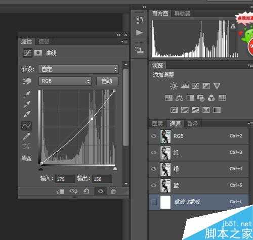 7、效果图一出,有些朋友可能就感觉出来了,脸部有太多缺陷,色差很大,我们接下来要使用曲线对红绿蓝三个通道调整,具体调整数值仅供参考,视情况而定,大家可以自己把握