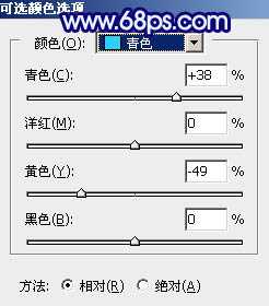 1、打开素材图片,创建可选颜色调整图层,对黄色,绿色进行调整,参数设置如图1,2,效果如图3。这一步主要把图片中的绿色转为青绿色。