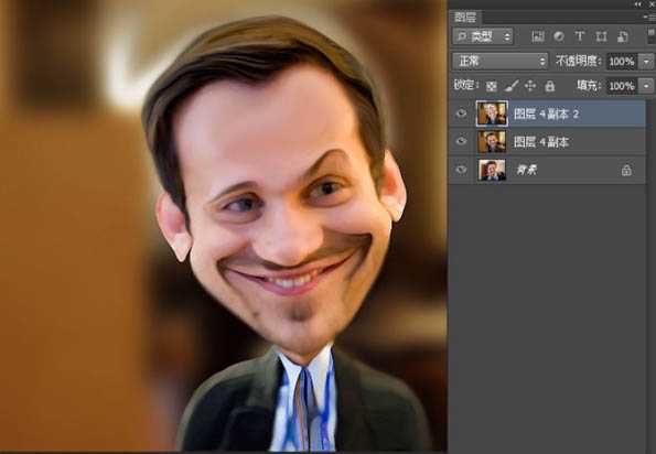 3、通过液化工具,开始调整头部,将人物的特点尽可能的夸张,工具就太简单了,不明白的选中工具,点击人物就明白了。