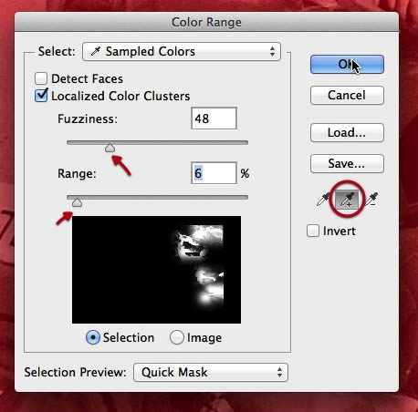 现在使用色彩范围工具(选择->色彩范围),选取图中由于环境光以及反射导致的黑色阴影区域。(其实纸张弯曲也是一个原因)