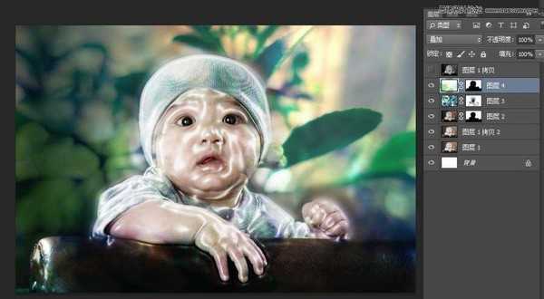 12.打开素材盆栽,叠加,80%透明度,添加蒙版擦除宝宝部分,适当留一些浅浅的绿色反光在宝宝身上