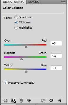 色彩不同的颜色值尝试:图像——调整——色彩平衡(阴影,-9、-13、0,勾选保持明度;中间调,3、-19、3、勾选保持明度;高光,12、-3、1,勾选保持明度)。如图所示: