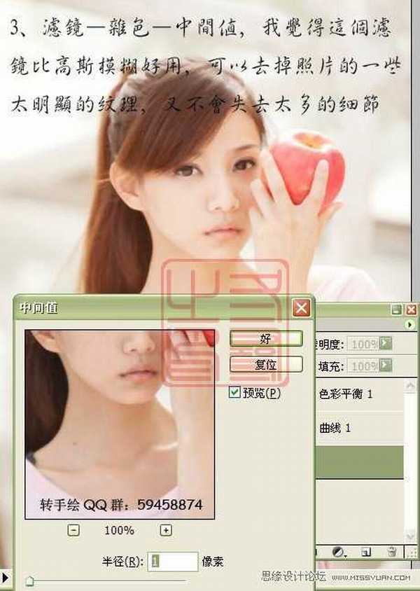 3、执行:滤镜 > 杂色 > 中间值,我觉得这个滤镜比高斯模糊好用,可以去掉照片的一些明显的纹理,又不会失去太多细节。