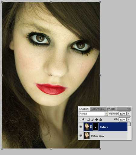 3、不要取消选区,“图层”-图层蒙版-隐藏所有,然后用白色(#FFFFFF)填充选区。这样,嘴唇可见,脸的其余部分将隐去。(译者注,直接点击图层面板上的蒙版按钮就可以了。不要去菜单里找啊找……)