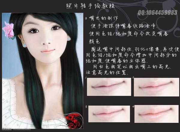 使用涂抹工具将嘴唇纹路涂净,使用色相/饱和度命令改变嘴唇颜色。圈选嘴中间部分,羽化2个像素,再次使用色相/饱和度命令增加中间部分的饱和度,加强嘴唇的立体感。然后用白色画笔画出嘴唇上的高光,注意好高光的位置。