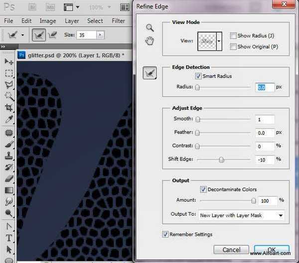 6、保持选区,再选择菜单:选择 > 调整边缘,参数设置如下图,记得勾选输出选项中的颜色净化。