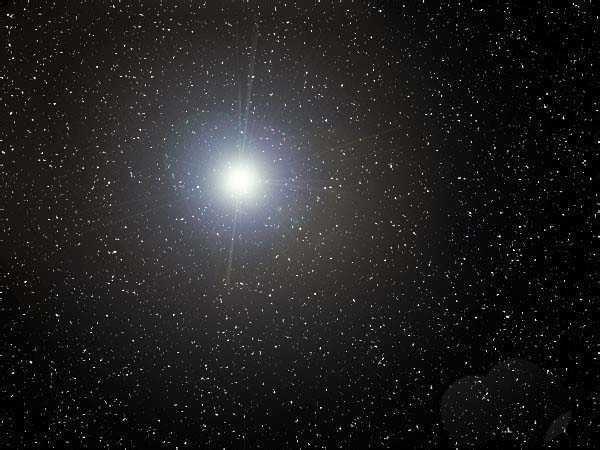 5、选择“图层”→“新建”→“图层”,用黑色填充图层。选择“滤镜”→“渲染”→“镜头光晕”,选中105毫米聚焦,确定。用镜头光晕来代表最近的恒星。也可以添加其它效果。