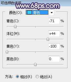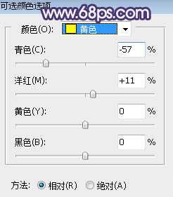 3、创建可选颜色调整图层,对黄色、绿色、青色进行调整,参数设置如图3 - 5,确定后用透明度为15%的柔边黑色画笔把底部区域涂出来,效果如图6。这一步给背景部分增加黄褐色。