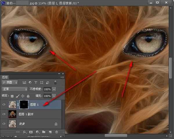 07.这一步是是处理猎豹獠牙嘴部区域,将图层1副本复制一层得到图层1副本2添加图层蒙版去除掉多余部分只保留獠牙嘴部;按住ctrl键单击图层1副本2缩略图得到獠牙嘴部区域,复制选区得到图层3;经过上系列操作大功告成;