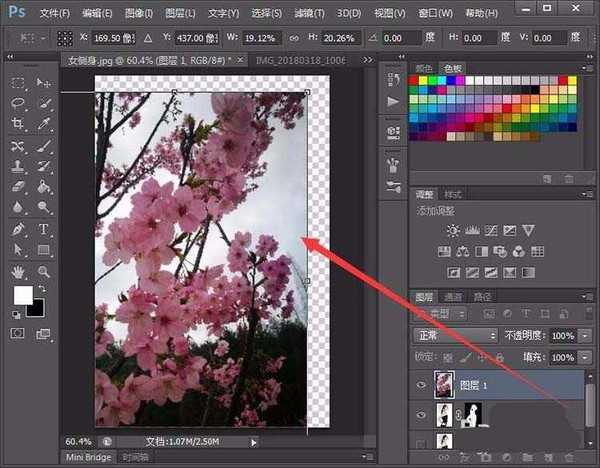 6、接着,打开拖动一张图片到人物窗口中,并调整至合适大小。