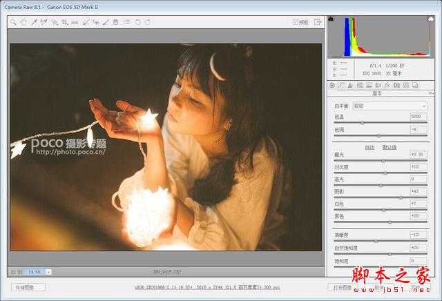 首先把照片拉到ps里,一般我的习惯是先在cameraraw里把整体色调先调整好,然后再到ps里微调。这组片子是暖色灯光为主,所以颜色比较单一,调整起来比较简单。第一步先调整色温亮度等这些基本参数。提高亮度可以让画面看起来更柔和更有梦幻感一些。