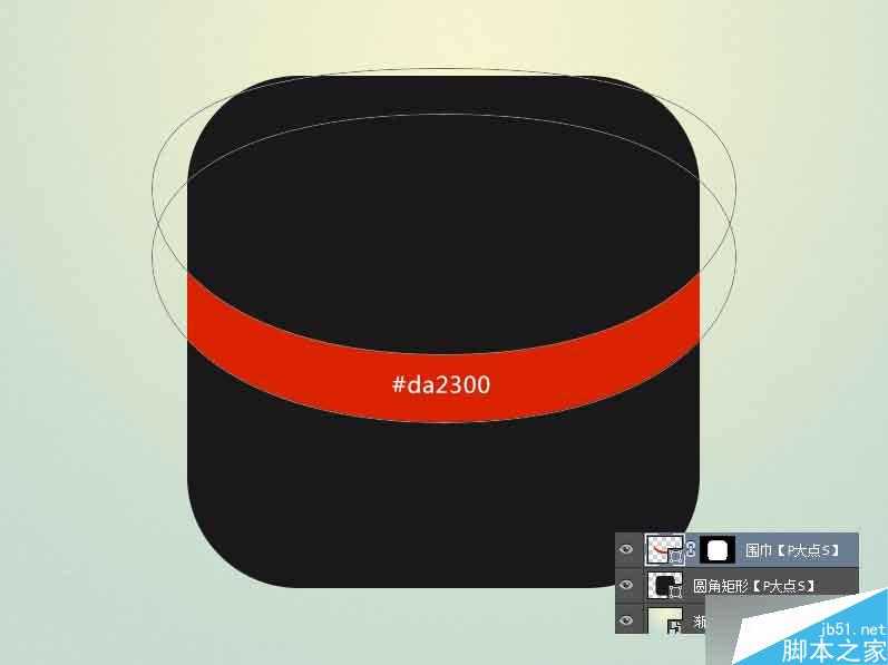 用两个椭圆相减,画出企鹅的围巾,这里我用的颜色是#da2300,载入圆角矩形的选区,给围巾添加一个图层蒙版,以保证围巾不会超出圆角矩形。