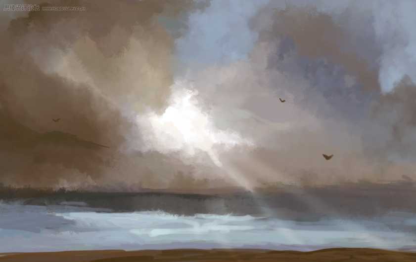 现在我们能够返回这个混合工具,使底部的云雾更多一些。而且,你可以开始混合你加进来的其他的颜色。记住,随着距离的远去,你的颜色将会变得顺畅,如果他们击中领域深处的图像。一旦你已经完成你所瞄准的图像,你可以开始触摸一些云雾。如果你已经有了一个制作云雾的笔刷,这是很有帮助的,我有少数几个,仅仅是一滴任意的云雾颜色将会给出更多的定义。用这个触摸完成,这是你的选择,加一些鸟会赋予这幅画活泼的感觉。