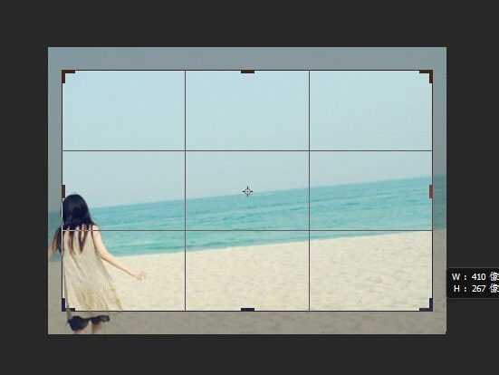 4、我们看到,我们的这张图片,图中海平线和沙滩线都比较倾斜,我们就可以利用裁剪工具调整。点击裁剪工具,图片就出现一个可以调整的框,利用节点就可以伸缩,鼠标在方框外我们看到鼠标必成一个旋转图形,按住左键可以旋转图片。