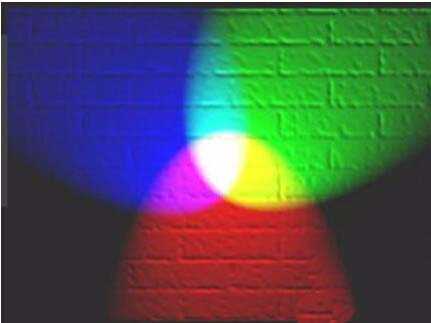 如在一面白墙上,开红、绿、蓝三种颜色的灯,并两两相交,可以得出青品黄三种颜色,并综合相交的部分为白色,这是一种典型的加色模式。
