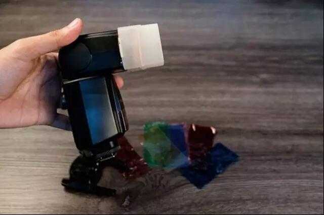 将滤色片固定在闪光灯上,你可以选择任意你喜欢的颜色,用胶带固定后,加上柔光罩,可以削弱闪光灯的光线硬度。