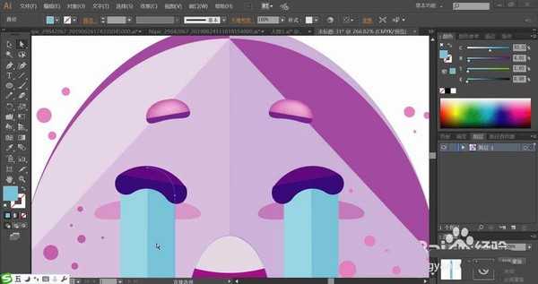 7、最后,我们用紫红色填充脸部上面的大小不同的圆点并使用网格工具做出紫红色渐变效果,再用暗紫红色填充脸颊的左下侧暗光路径,完成流泪表情设计。