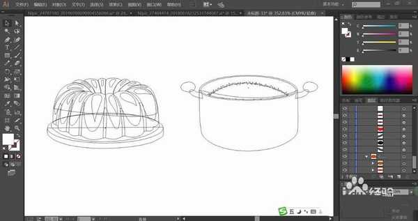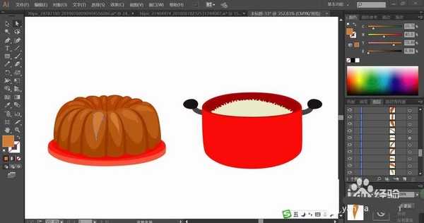 7、最后,我们用网格工具给铁锅做一下渐变效果,让铁锅的正面呈现红白、红黄、红橙等多种色调的渐变,再给铁锅两侧的手柄做一下灰白色的渐变效果,从而让金属材质呈现在手柄上面,完成饭菜图片设计。