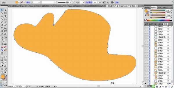 4、我们用橙红色到橙黄色的渐变来填充这些不规则的圆形路径。