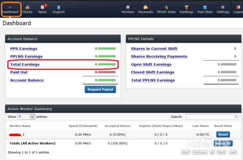 注:在这个监控仪表盘中我们最为关心的是“Total Earnings”,这就是我们当前账户所挣的比特币。以后只要我们打开网站,进入监控仪表盘就可以看到自己账户的相关信息了。