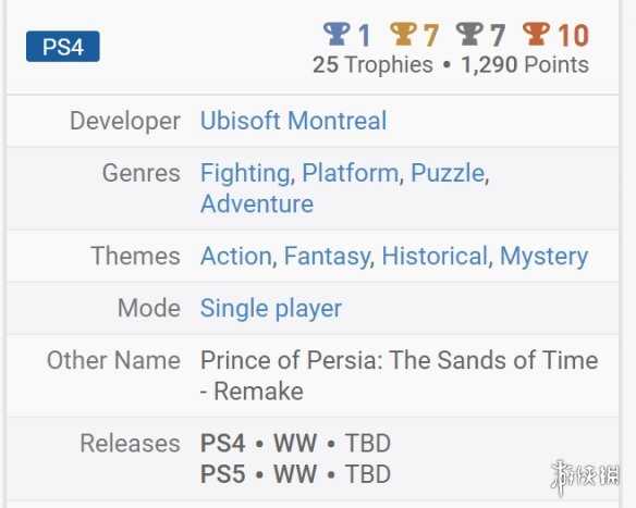 近日PSNProfiles(奖杯追踪网站)泄露了《波斯王子:时之沙 重制版》PS4版的成就奖杯列表,这表明游戏至少没有被搁置,甚至可能会很快发售。