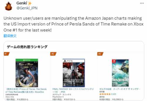 近日,日本亚马逊销售排行最新数据出炉,但榜单似乎出现了一些奇怪的问题:美国进口Xbox One版《波斯王子:时之砂重制版》排在了第一名,位列二三的游戏分别是即将发售的《最终幻想16》和近期热门《塞尔达传说:王国之泪》。