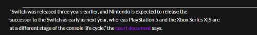 法庭PDF文件显示:无论行业编号惯例如何,任天堂Switch属于“当世代”的游戏机。此外,预计任天堂最早将于明年发布Switch的继任机型。而PS5和XSX|S正处于其主机生命周期的不同阶段。