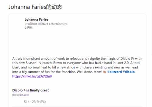 日前,暴雪娱乐总裁约翰娜·法里斯也在领英发文表彰了《暗黑破坏神4》背后的团队:“随着新赛季的推出,我们付出了巨大的努力,重新聚焦并点燃了《暗黑破坏神4》的魔力,向所有人致敬。干得好。”