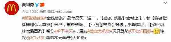 比如,上面是麦当劳以及OPPO手机官方微博发布的转发抽奖活动,两个活动设置的参与规则有所区别,麦当劳是为了宣传新上市的薯条,要求转发并@3位好友;而OPPO手机是为了宣传机器人大赛这个活动,要求带话题并转发抽奖。