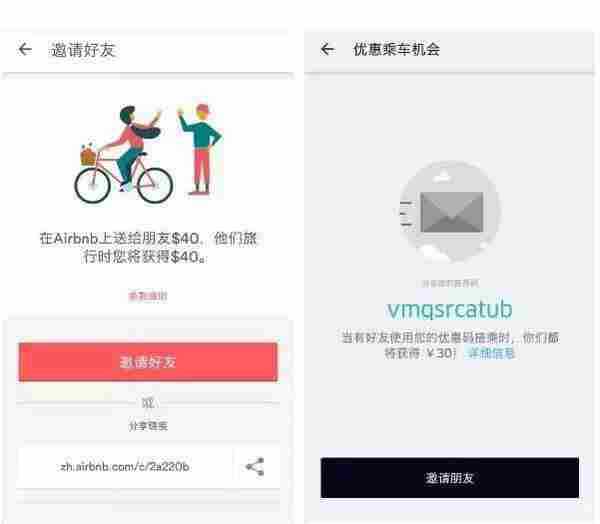 在分享机制上,Uber和Airbnb是翘楚。这两个产品的分享采用的是User Referral,可以理解为「介绍人机制」。采用一对多的方式,让用户介绍自己使用的产品,推荐给好友使用,一旦成功推荐,好友开始使用产品了,那么推荐者和被推荐者都会获取奖励。